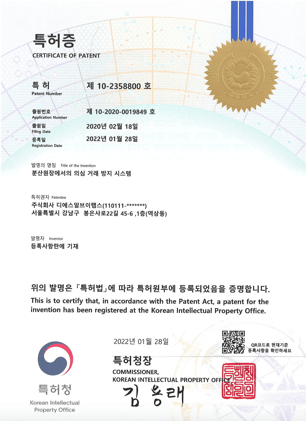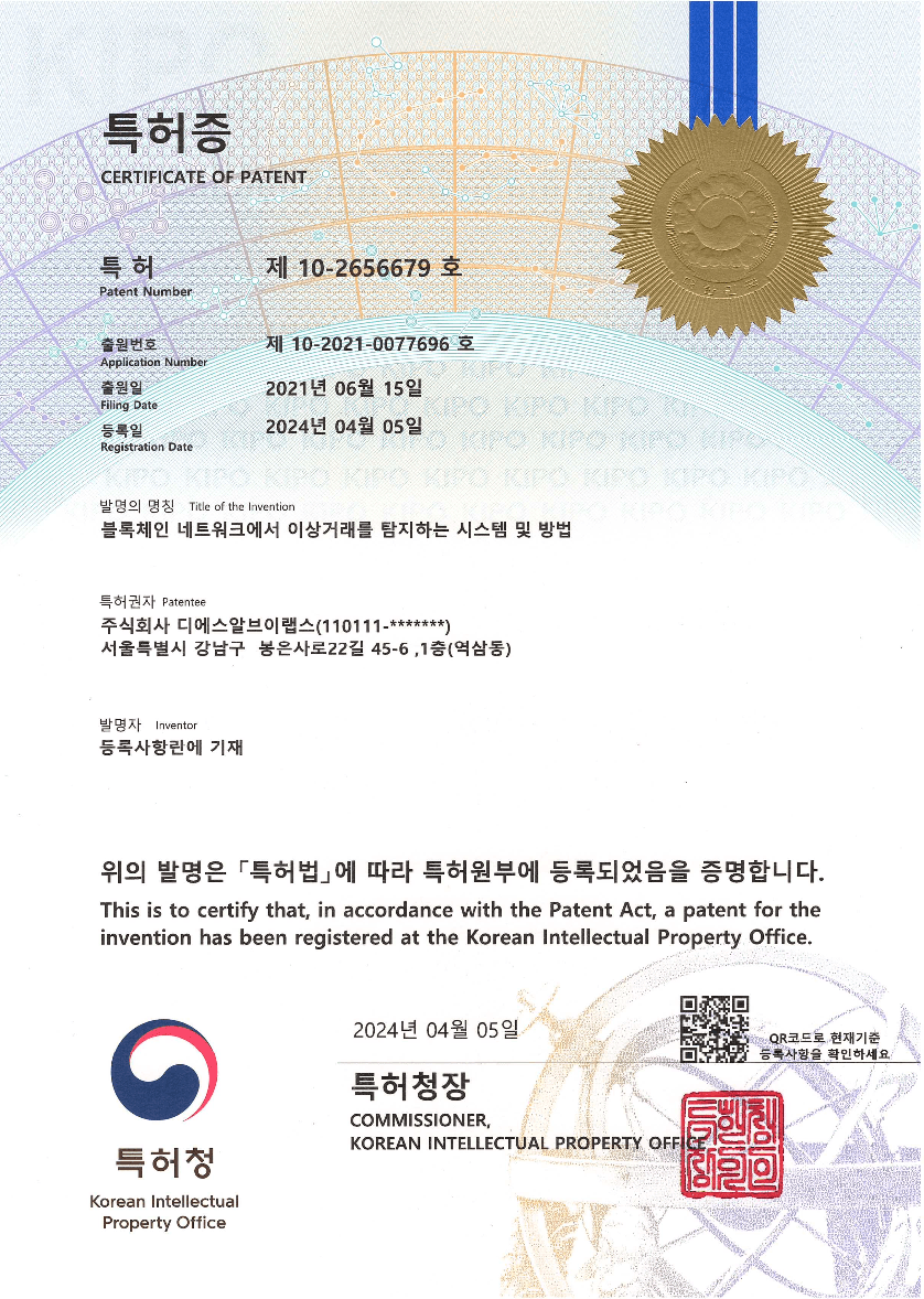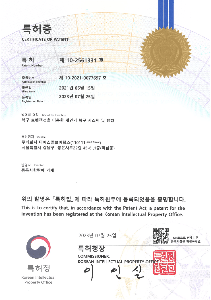 three technology patents, including key recovery.